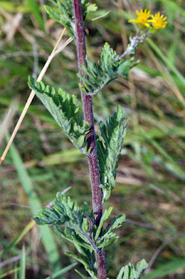 It's easily differentiated from Common Ragwort by its leaf arrangement as shown here. #they often curl inwards as well. Though it's supposed to be woolly hairy it often isn't. But Common Ragwort leaves do not look like this and neither do the other Ragworts like Oxford and Fine-leaved.
